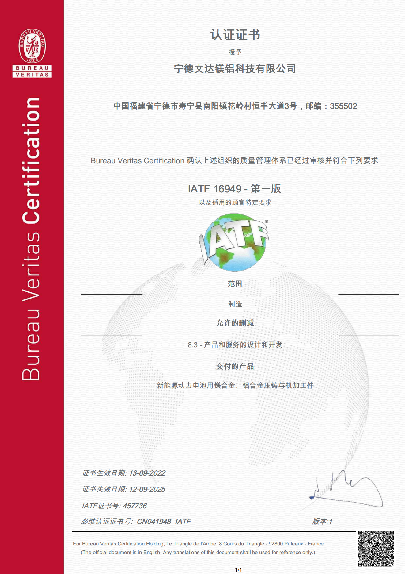OEM经验 宁德时代 证书 IATF16949 ISO9001